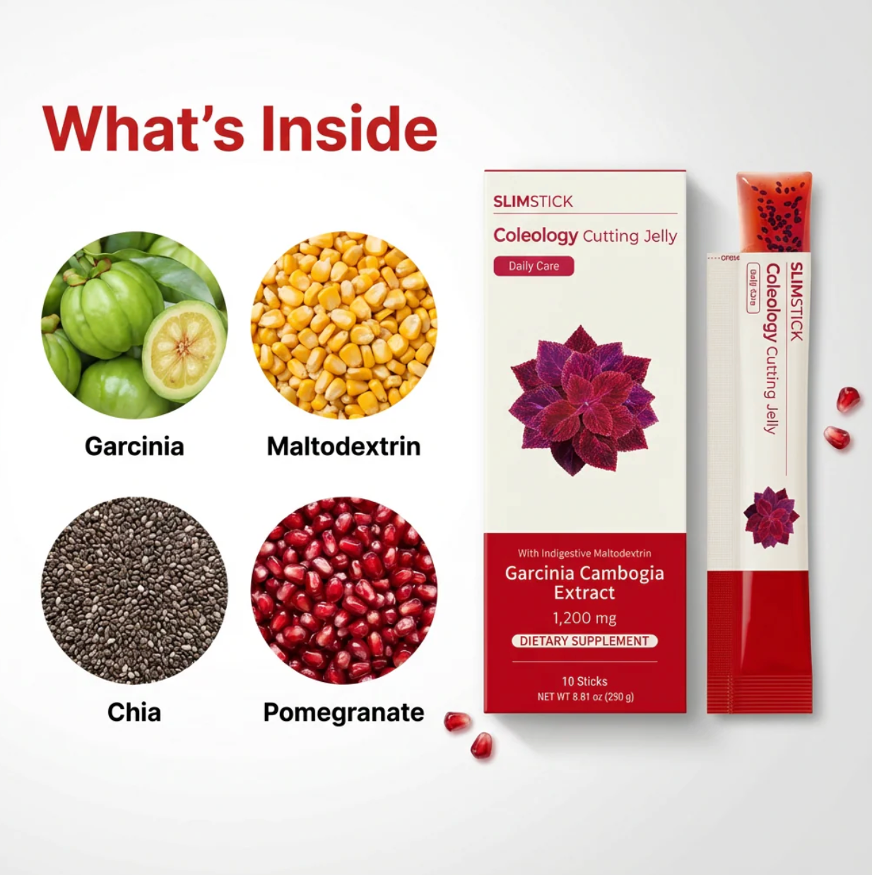 Each box contains 10 individually wrapped jellies, packed with skin-loving ingredients like Garcinia Cambogia, Collagen, Hyaluronic Acid, and Pomegranate Extract to support gut health and glowing skin from within.